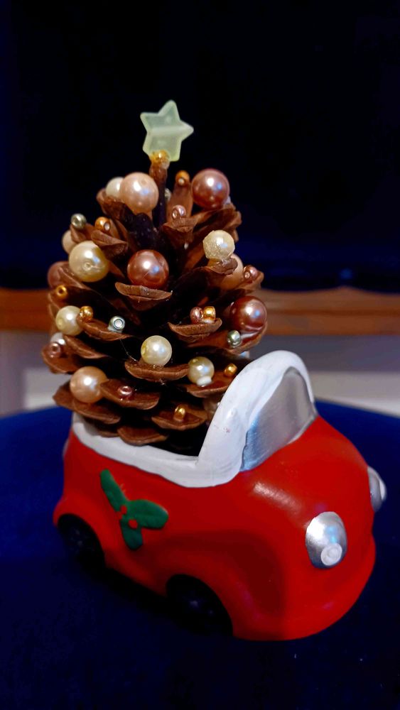 松ぼっくりに大量に真ん丸なものを付けてキラキラに。