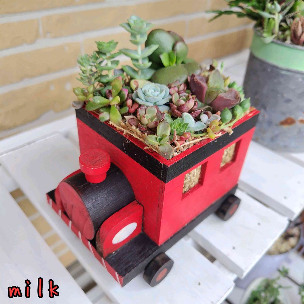 ありがとうございます〜⸜(> <⑉))⸝キャッ♡💕この木製の汽車は 鉢じゃなくて小物入れなのかな(˙˙*)? 底穴を開けて 穴の部分にペンキを塗りました。窓🪟の部分は開いてるので麻布を内側に使って寄せ植えしました❣️汽車の おかげで可愛さUPでラッキーです(≧∇≦)✌️🍀