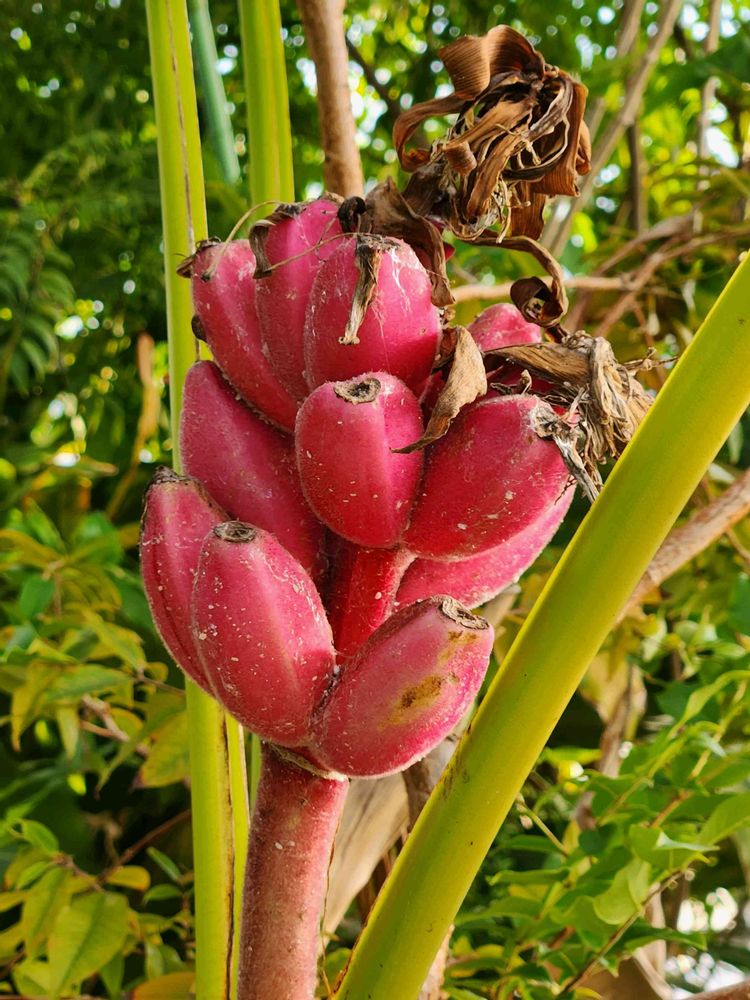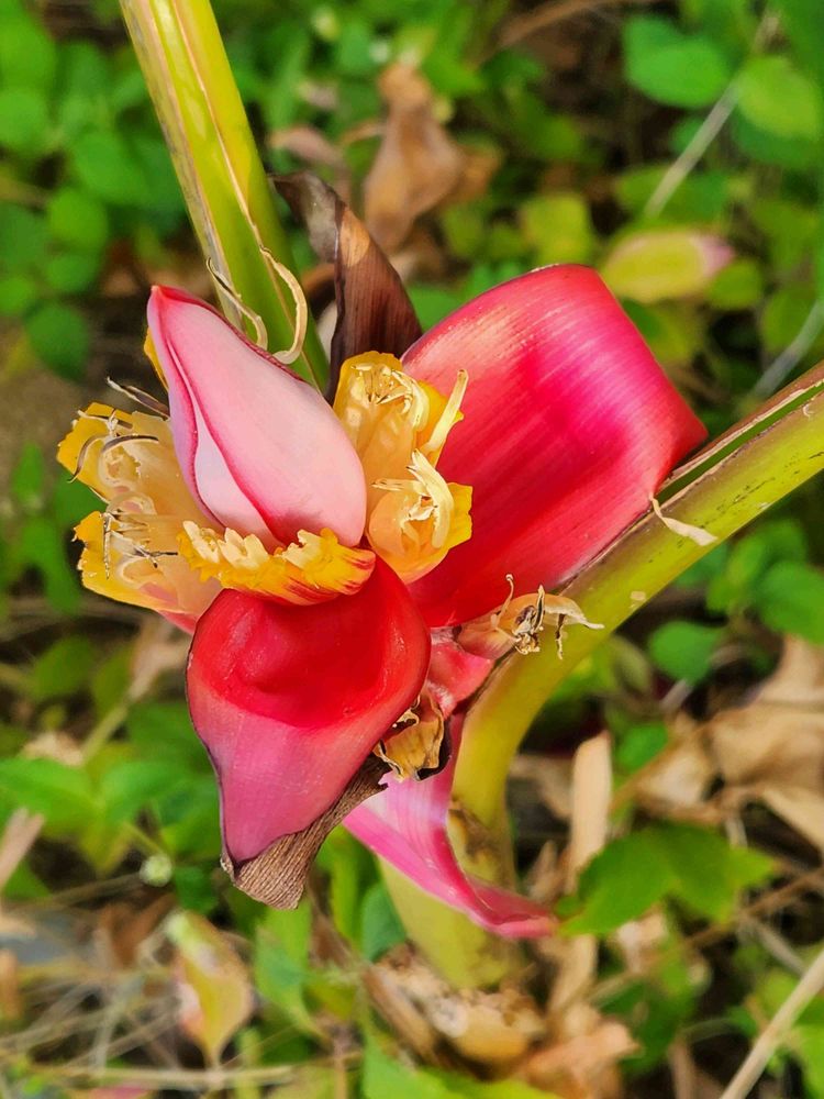 インド原産で、アケビに似た形のピンク色の実をつける原種のバナナで、ピンクは苞で黄色いのが花です