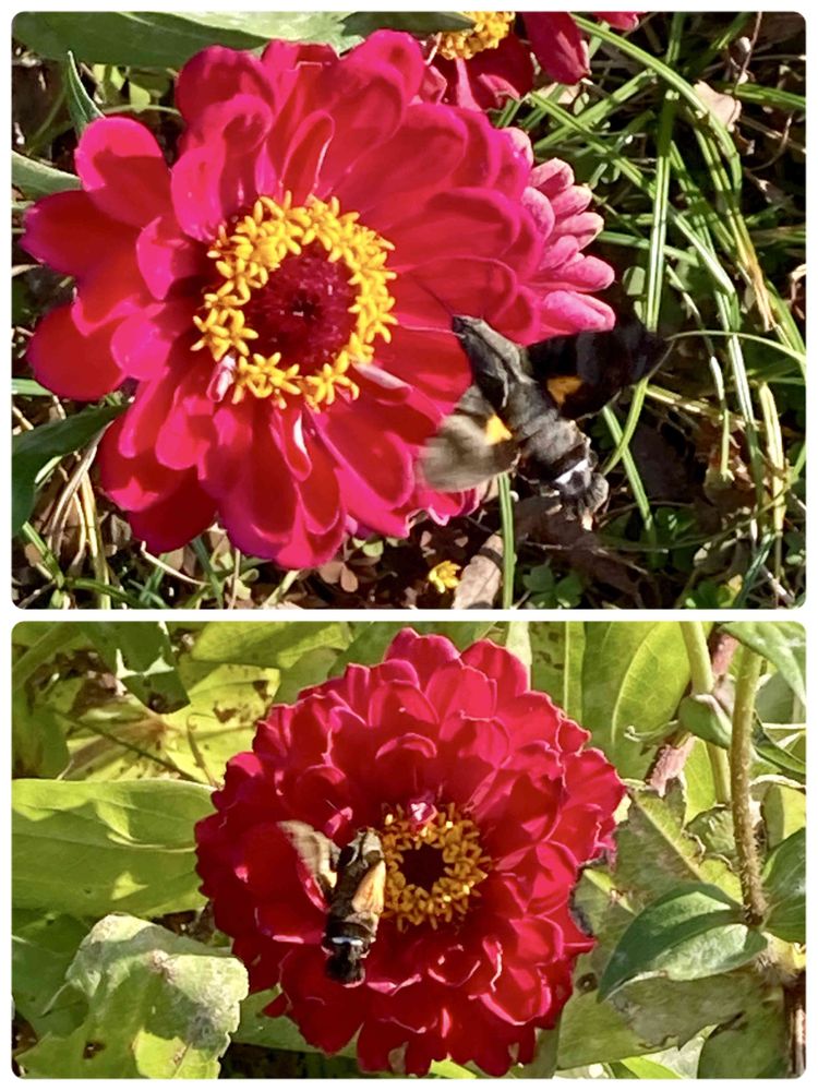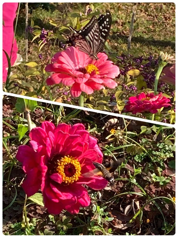 アゲハチョウとホウジャクが忙しくヒャクニチソウの蜜を集めていた。