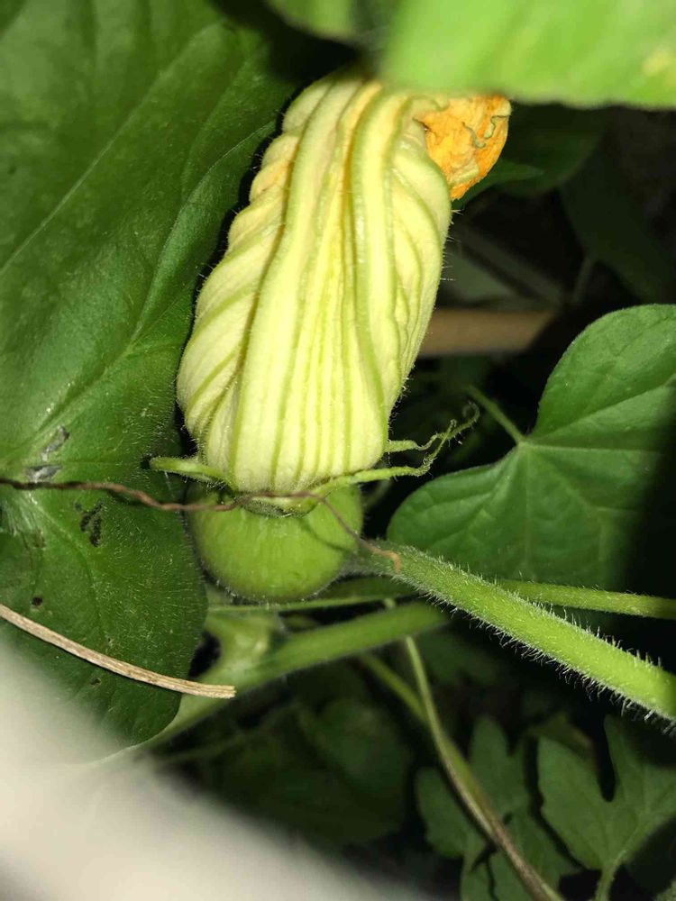 カボチャは実をつけないと思っていました。そして、花だけを楽しもうと思っていたら、小さな実がプックリと1つだけ出来ていました。