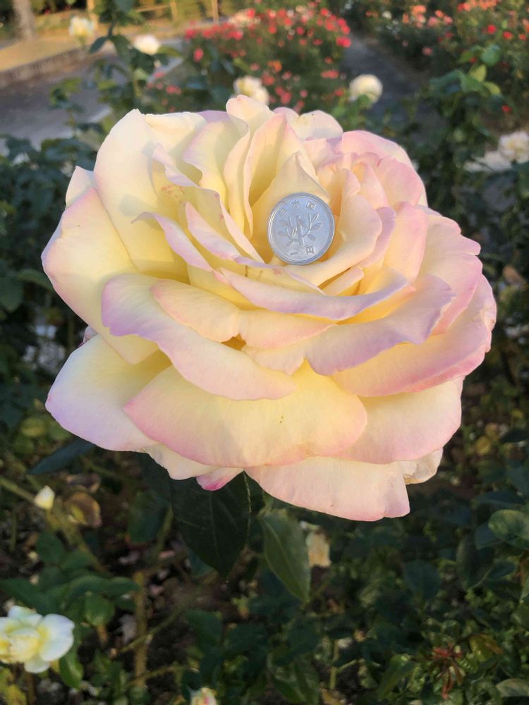 先日、万博公園のバラ園にて、フランス🇫🇷製の大きなバラ「ピース」をパチリ!📸🏵️🌿😄🤗🌆✌️