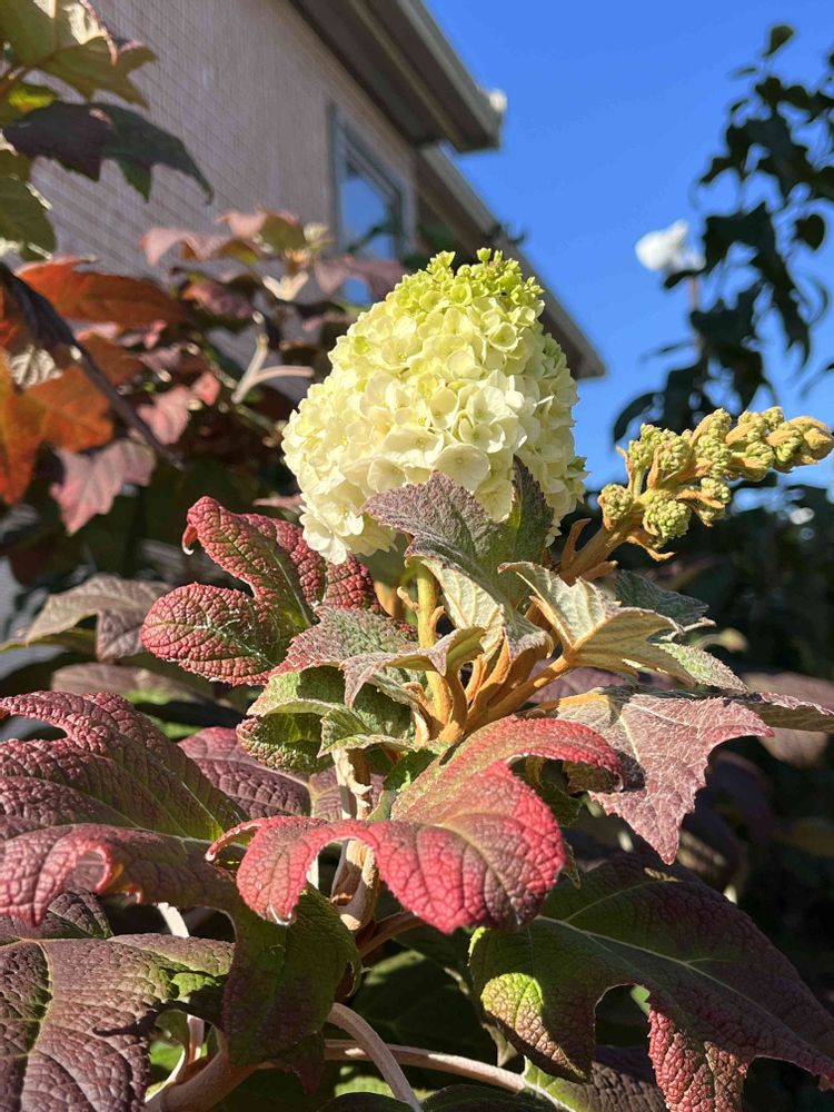 ③自宅の庭のカシワバアジサイ紅葉で葉が赤にまだ花もついてます。10/26
