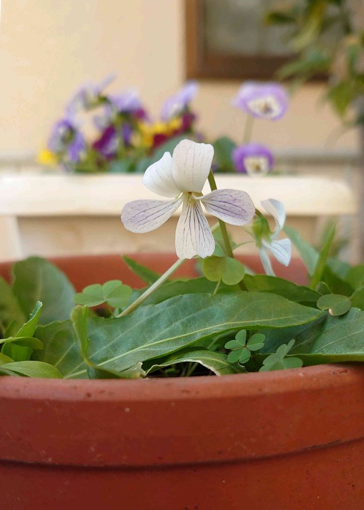 ガーベラの鉢に、小さな白地に紫のスミレが…見えますか?🤍💜