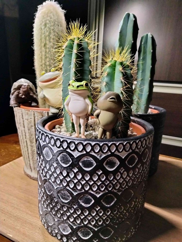 植木鉢もエキゾチックで、🌵サボテンちゃんたちも😍そして周りのギャラリーカエルちゃんたちも(笑)賑やかですなぁ👏👏👏😂
