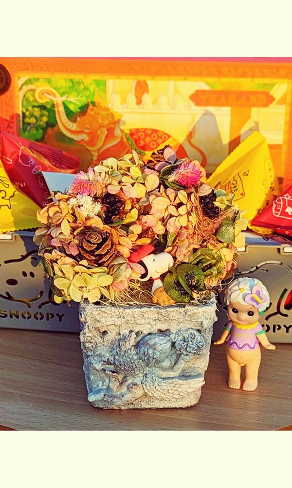 手作りののエンジェル👼鉢に手作りのスヌーピードライフラワーアレンジ