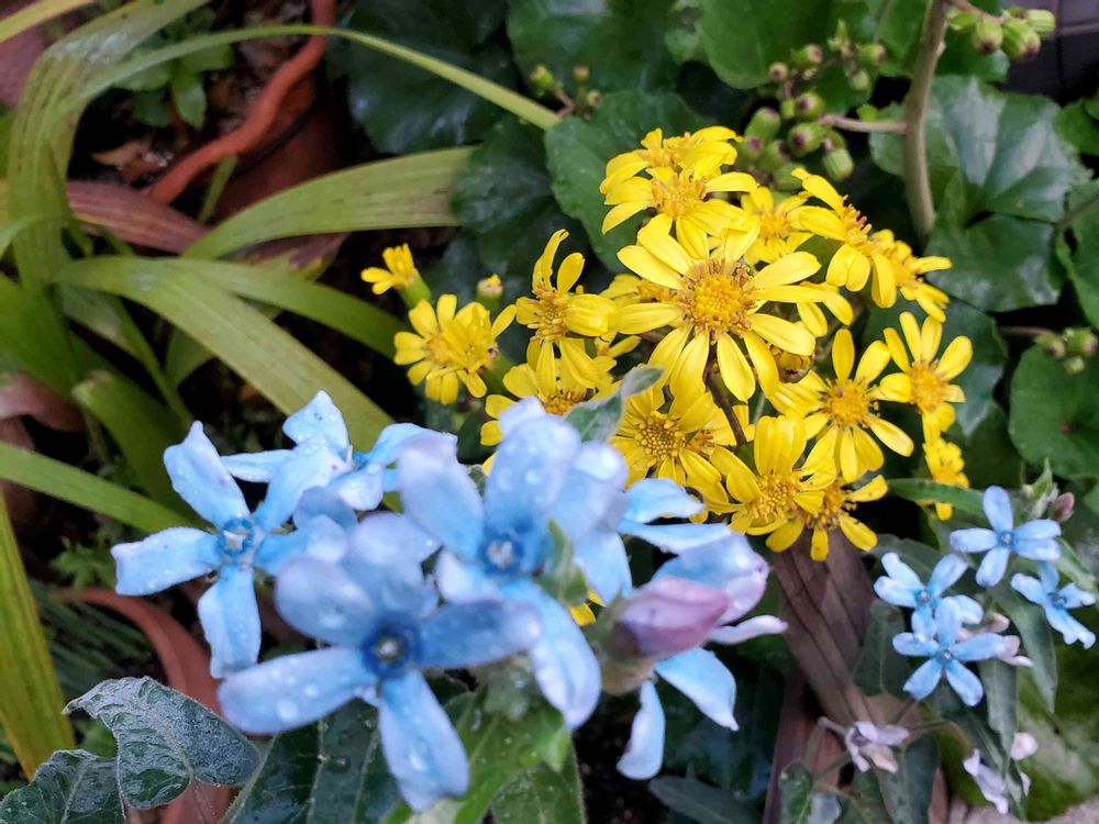 ブルースターは、春に種蒔きしたもので、ツワブキは姉宅に父が植え、毎年庭に綺麗に咲いていた1株を私も貰って育ています🤗
