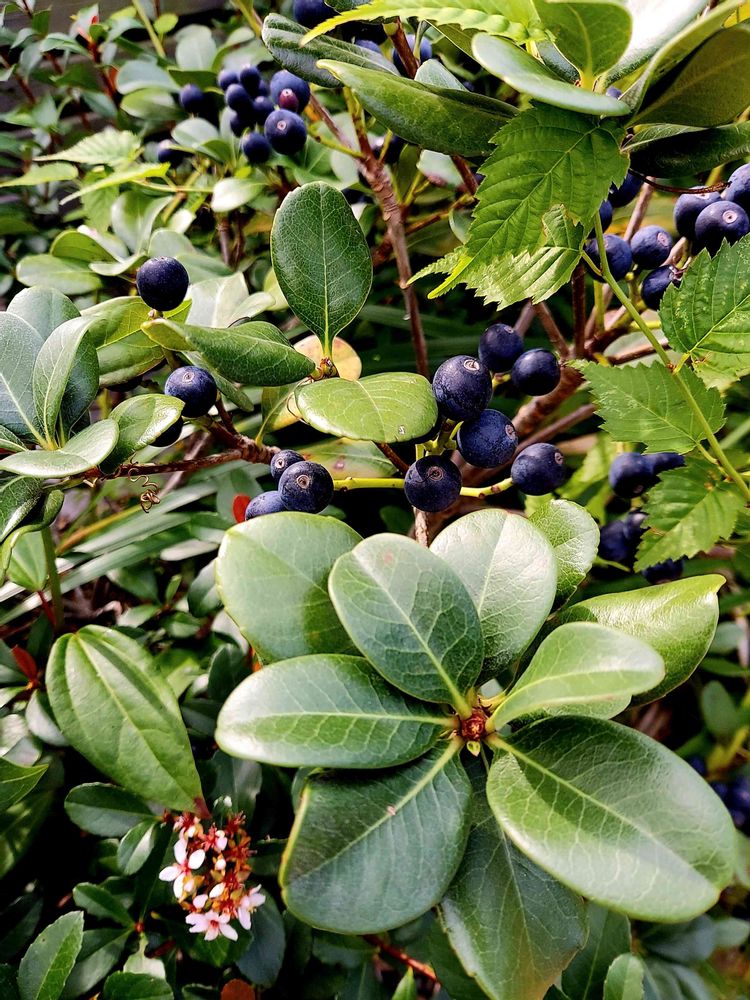 散歩途中で出会ったシャリンバイ👀‼️黒紫色のたくさんの実と梅の花に似た可愛いお花が咲いていました😃💓