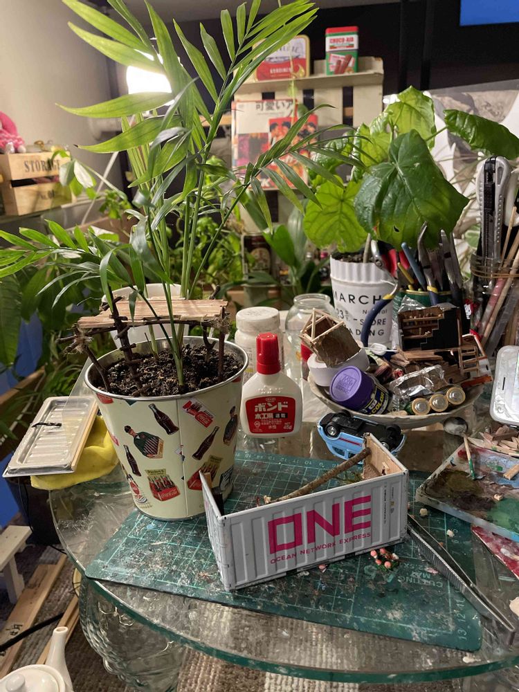 百均やら、 ホームセンターで売ってる 一番小さい観葉植物に、 ちっさい家、作ったりしてます。 ちっさい家用の家具も作ります。 窓にお弁当のふたとかのプラ貼って ガラスっぼく…電気もつきます💡