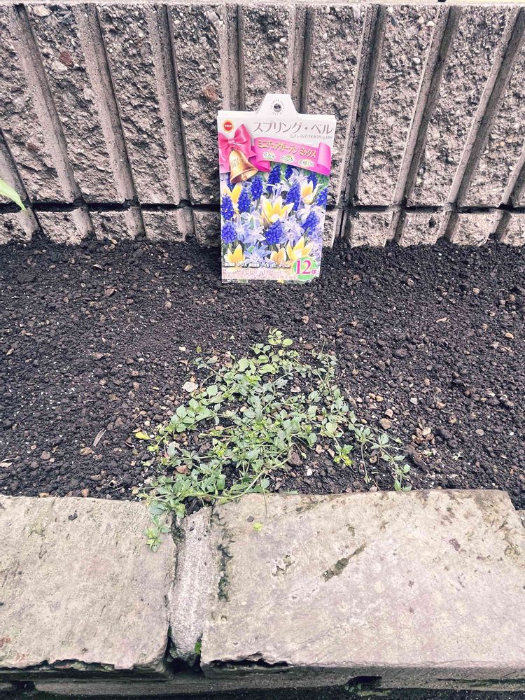 夏に投稿した薔薇の花壇の足元にミニチューリップ🌷ムスカリ、チオノドクサの球根を植えました🌱