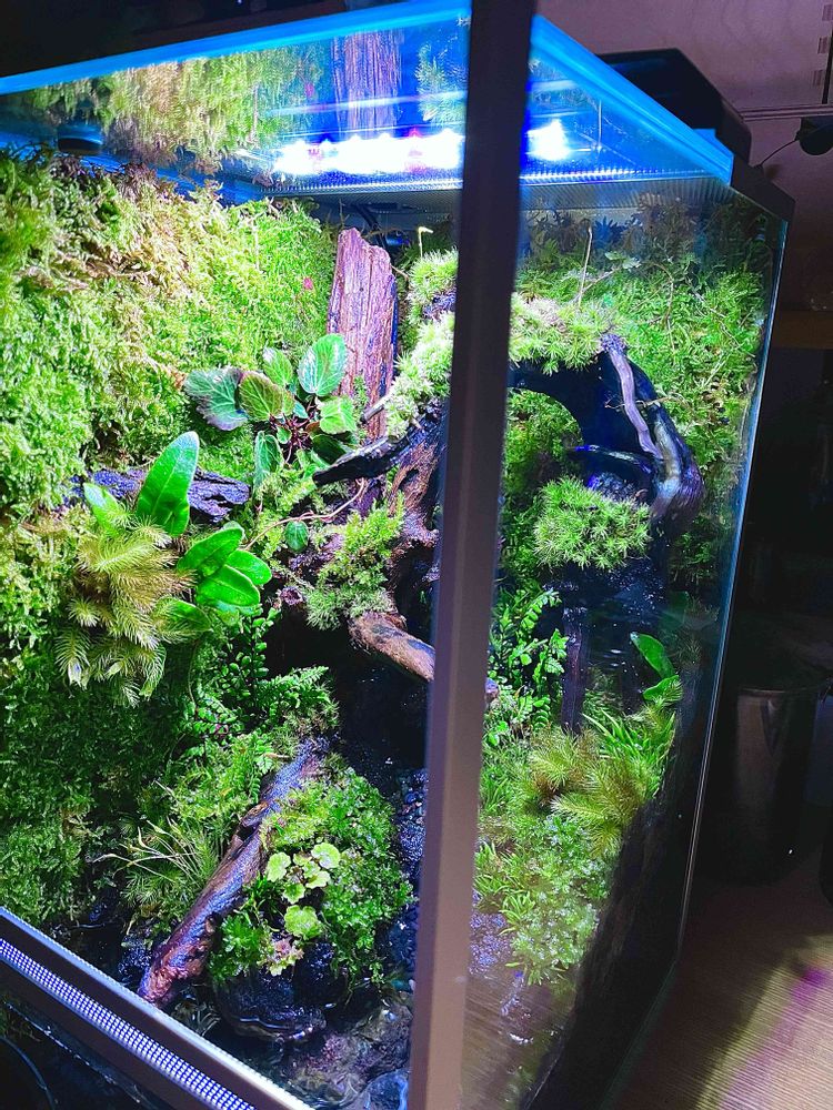 常に水が循環しているので、苔たちやイモリたちにとっては天国だと思います!