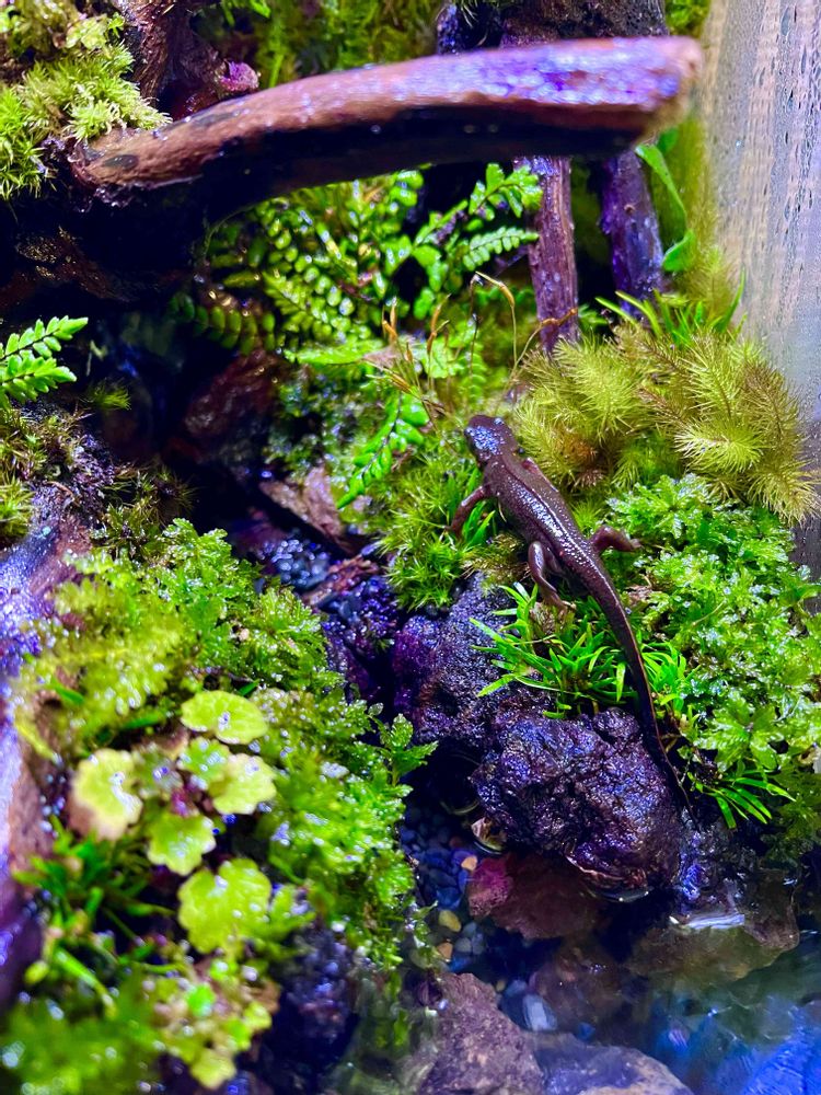 パルダリウムを作るつもりでしたが、苔が中心のコケテラリウムになってしまいました😅💦 濾過装置を滝に見立て、川も作りました👍 ハイゴケを側面に大きくレイアウトし、タマゴケ、ヒノキゴケ、タチゴケ、コツボゴケ、ツルチョウチンゴケを植えました。ところどころに山野草も入れています。マダライモリをお迎えするつもりでしたが、日本の森のようなレイアウトになったので、アカハライモリちゃんをペアでお迎えしました🤩✨