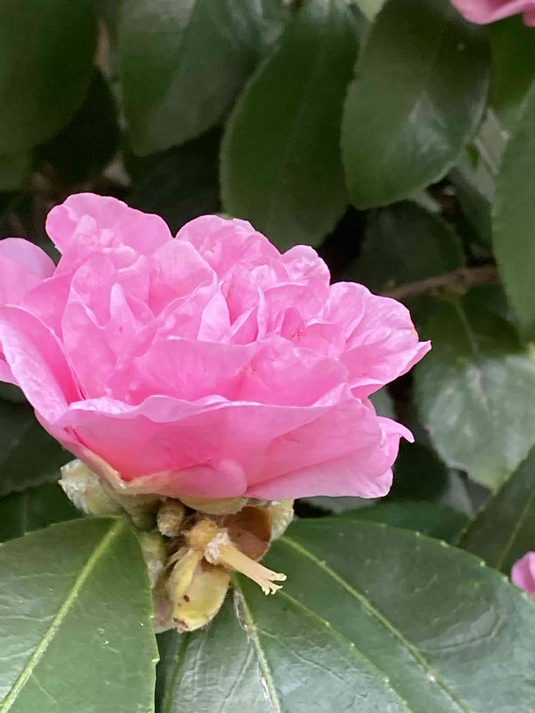 お向かいの八重咲きサザンカの花が咲き出しました。