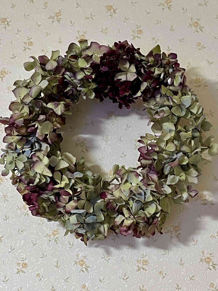 今までと色合いが違うドライにしたアジサイがまだあったので長い夜リースを作りました 2枚目はアナベルで 昨夜は2つ作りました 2つとも直径25センチ位てすね