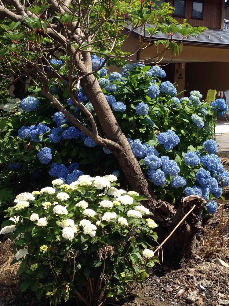 会社の帰り道に白と水色のアジサイが初夏の陽光を受けて輝いてました。