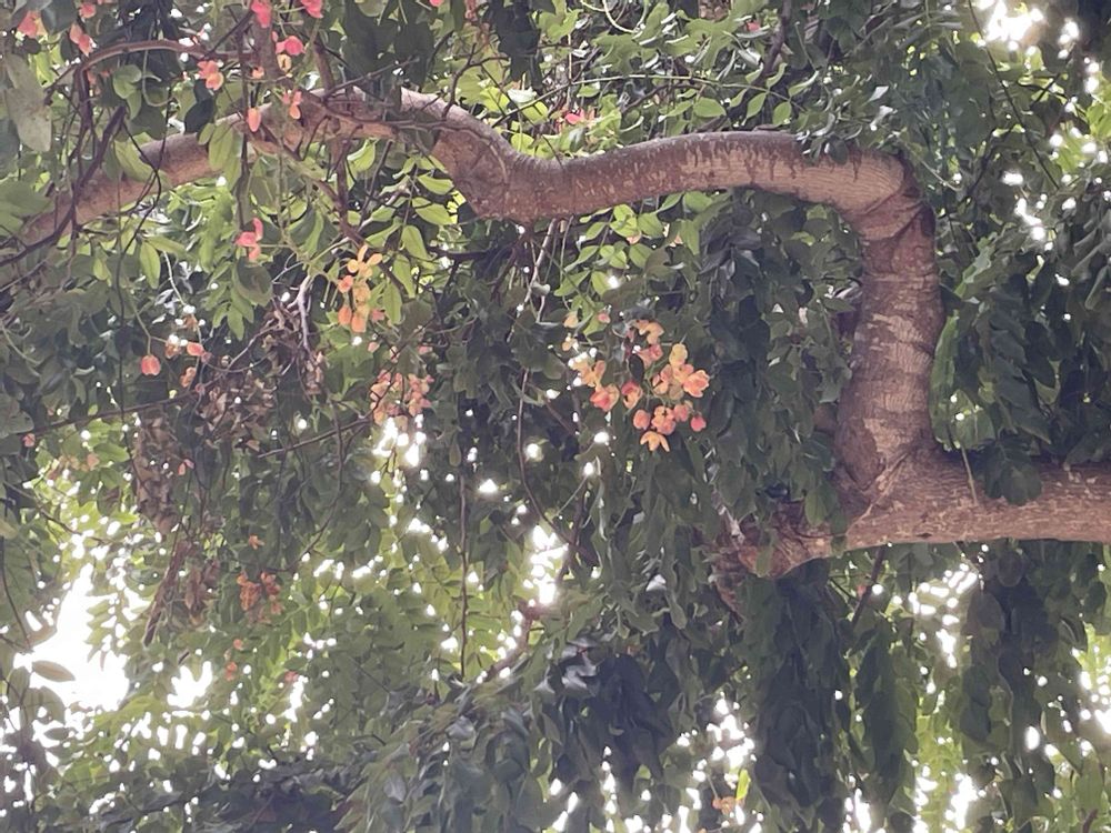 ゴールデンシャワーはマメ科Cassia属、拾ってきたタネから育てた家のコバノセンナと同じ属で見た目もコバノセンナのでっかい版という感じ。