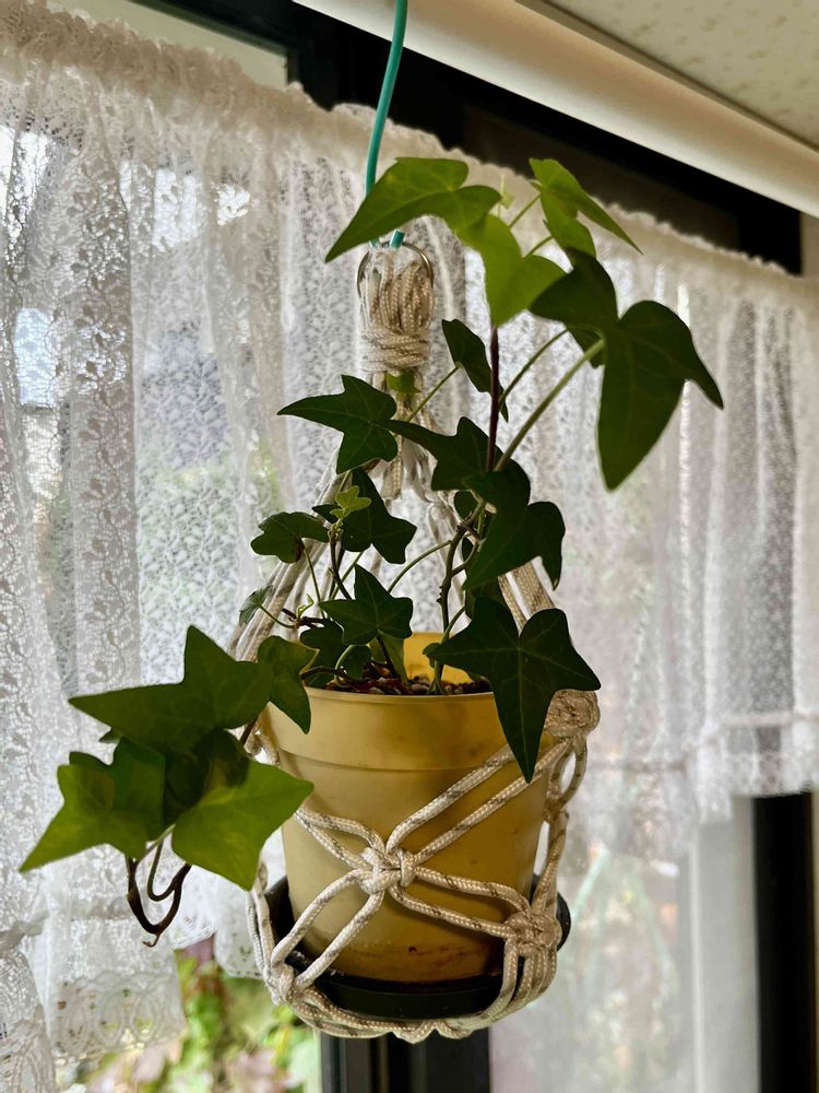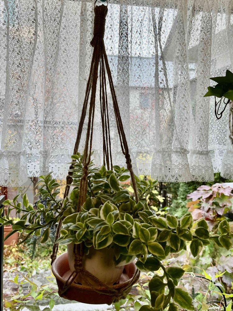 窓の外は雪 出窓に突っ張り棒を付けてベビーサンローズとヘデラの鉢を吊るしました 麻ひも等で編んで 主人の手作り ネットで調べて作ったようです
