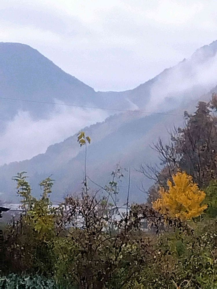 小雨が降っていたので近くに見える山並みも靄がかかり霧が湧き出て