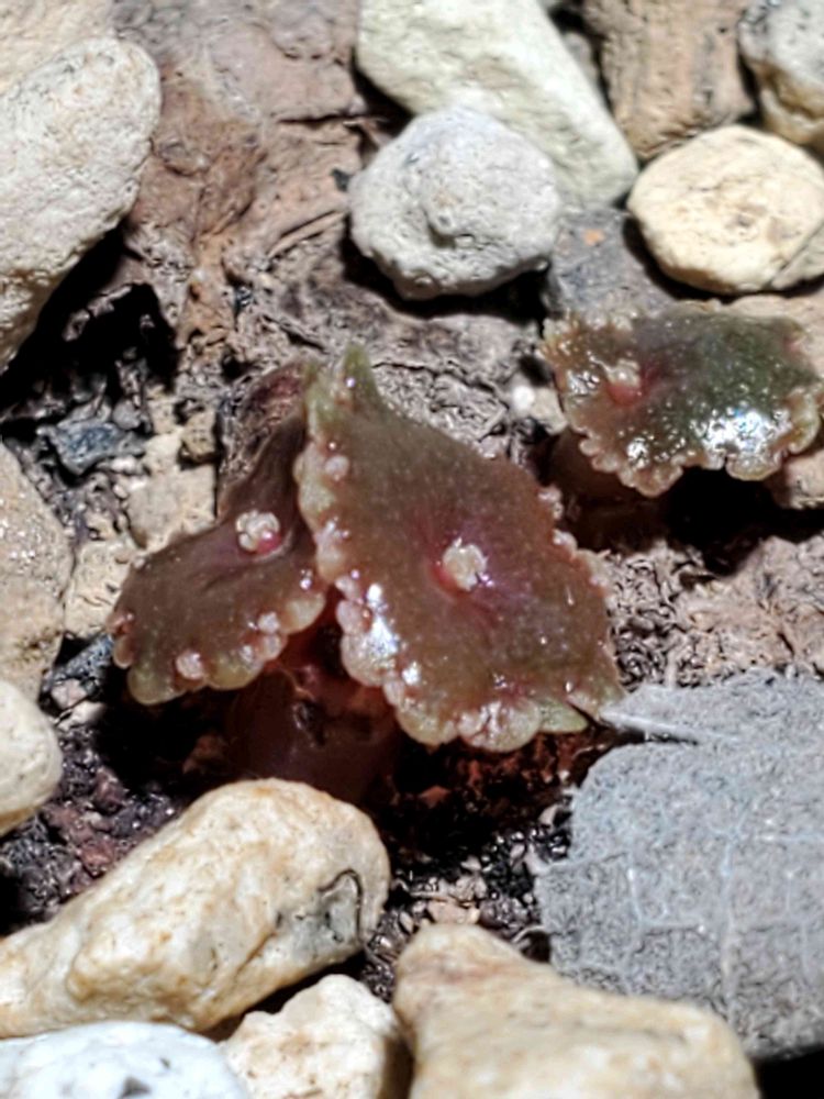 葉が赤から緑色に変化し始めました!去年の発芽に比べて、明確に中央の突起が目立ちます。