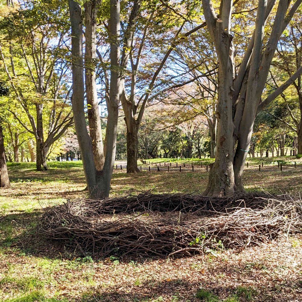 公園で出た剪定の枝などで枠くを作り中に不要な枝や枯れ葉を入れ腐葉土を作るそうです。
