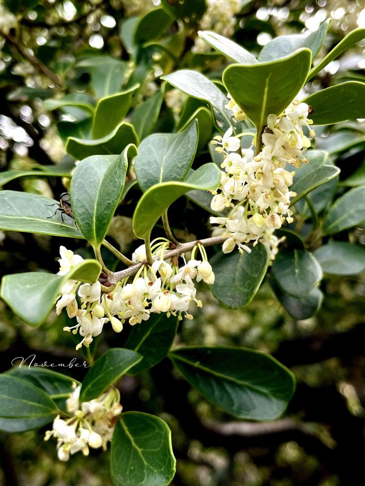 お花はヒイラギと一緒だけど、葉っぱ🌿のトゲトゲがない?!🤔