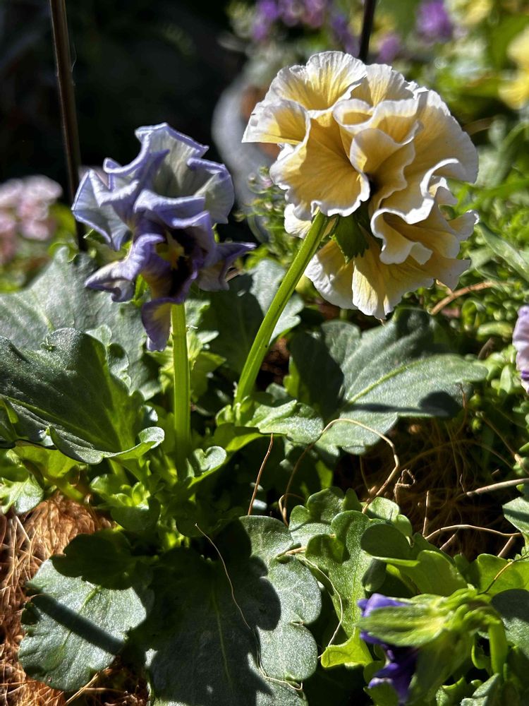 黄花の苗から青いお花も上がって来ました💛💙1株で色んなカラーが出るのかな⁉️この先も楽しみです🎶