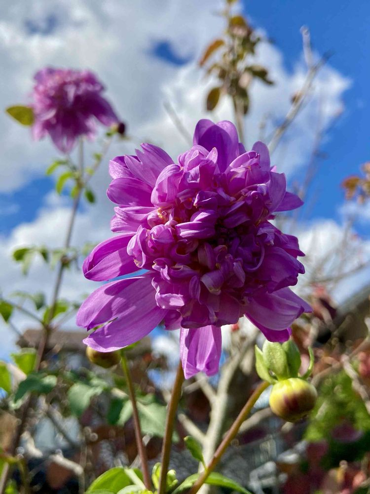 ☁️☀️秋晴れの今日の庭💜八重の皇帝ダリヤが咲いてた🥰🌹秋薔薇も終盤💖このまま気持ち良い天気が続くといいな🎵💕