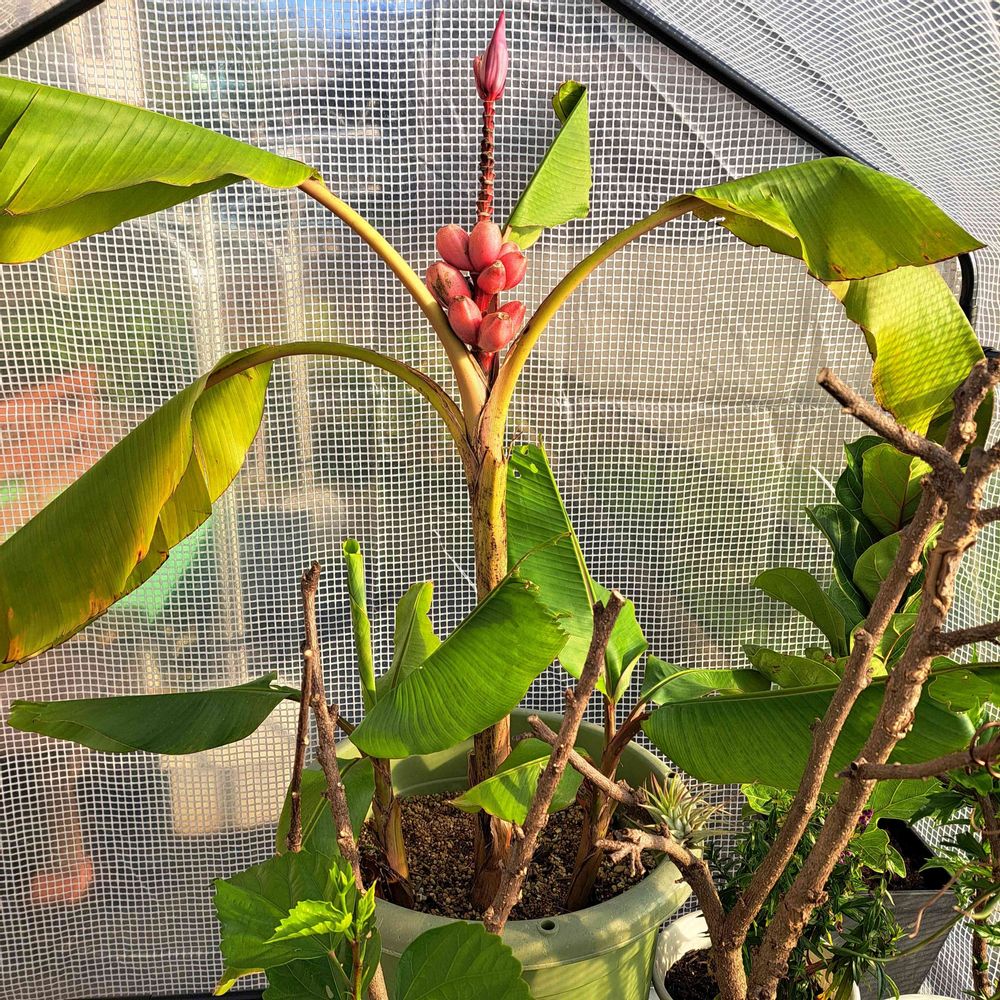①今年はビニ温室準備したので、ピンクのバナナさんをパパイヤ3兄弟畑から自宅に