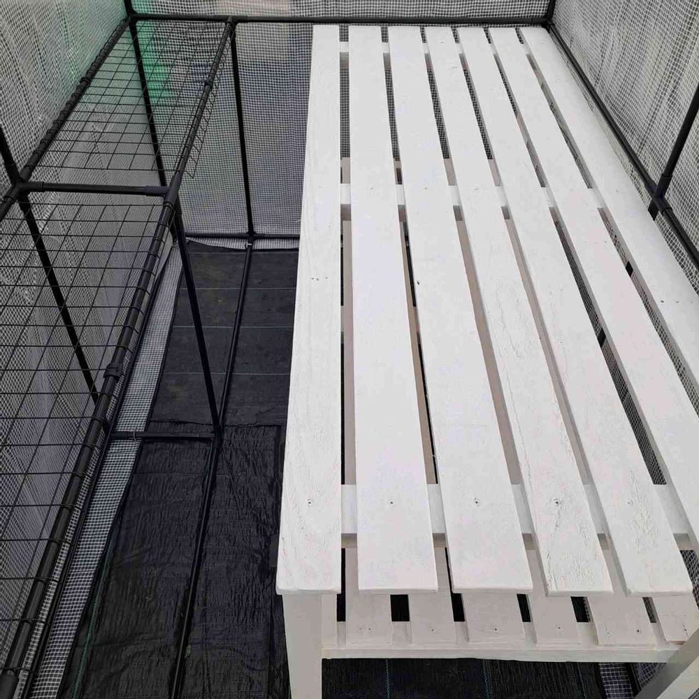 ②実はこの白テーブル棚、職場の廃材を利用して室内用で作ったのですが、設置場所の寸法しか考慮しておらず、自分の部屋入り口ドアが通らない。だから、庭設置のビニ温室です。