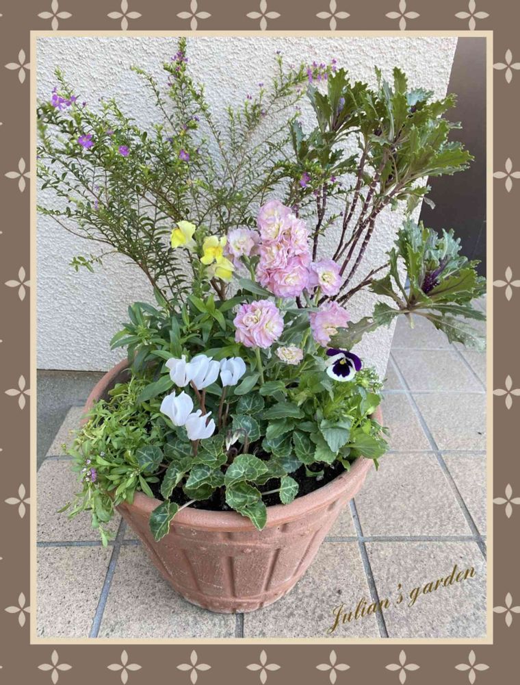 家にあるものとお値打ちの苗で寄せ植えを作ってしまうJulianさん、さすがですね🤗