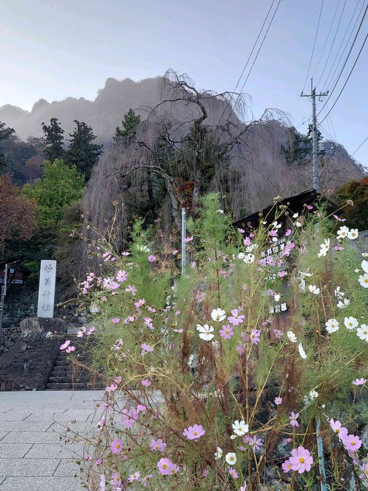 妙義神社入り口にはピンクと白のコスモスの花が咲いていました