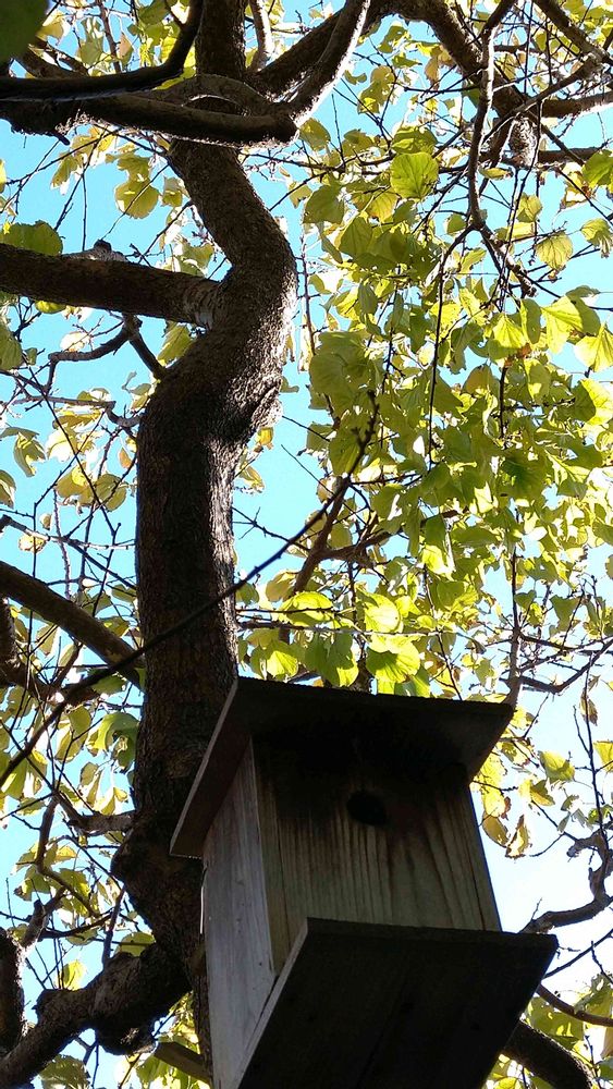 これは、夫が作ったのですが、巣箱の穴は、シジュウカラ用で、スズメも入れないのよ。