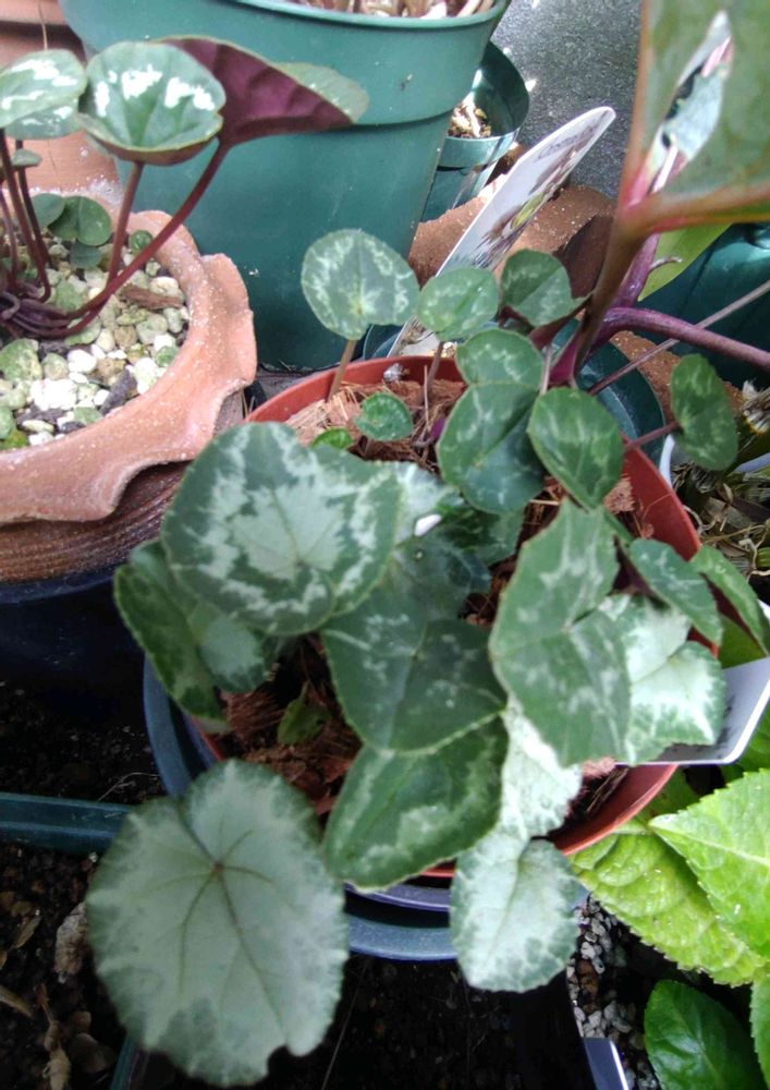去年種をまいてちょうど1年たったくらいの原種シクラメンヘデリフォリウムです。購入した種でいろいろ混ざっているとのことでした。葉が出始めるといろいろな色や模様があって面白いです。