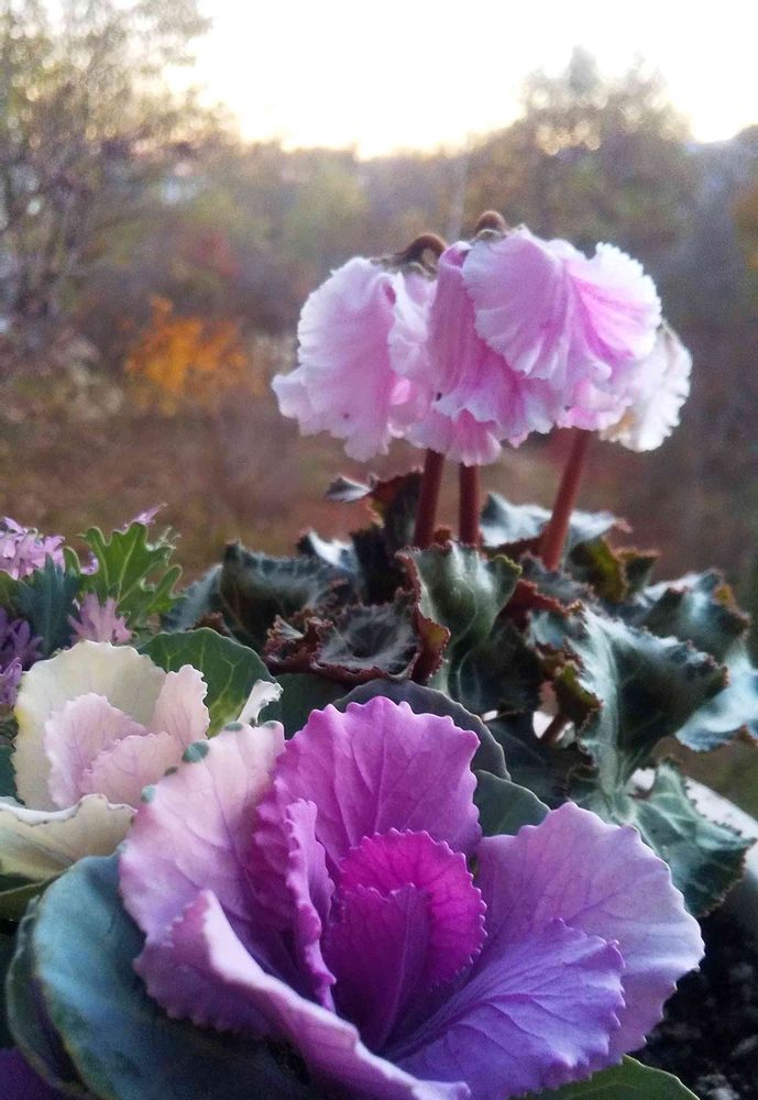 シクラメンと葉牡丹の寄せ植えが、ステキですね〜🌿🌸🌿🌸ピンクのシクラメンのフリフリちゃんもら可愛い😍