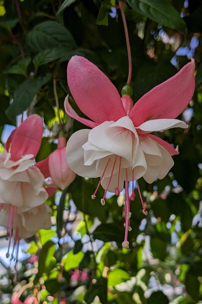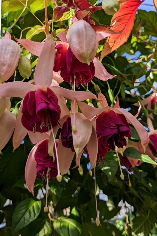 温室の中のフクシアは、いつ行っても、華やかで可愛い色合いで咲いています💖
