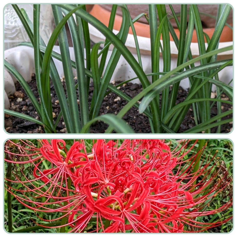 裏庭に生えているグリーンの🌿葉を鉢植えにして📱調べて見ると😳何と9月に❤️真っ赤な花が咲く彼岸花の葉でした(☉。☉)! 知らなかった〜デス¯\(°_o)/¯