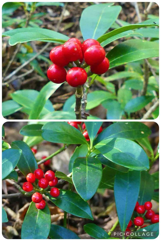 紅葉や黄葉は全然ダメだけど、それなりに秋の枯葉色に変わりつつある山の中で、真っ赤な実が鮮やかなのは「ミヤマシキミ」🔴😍
