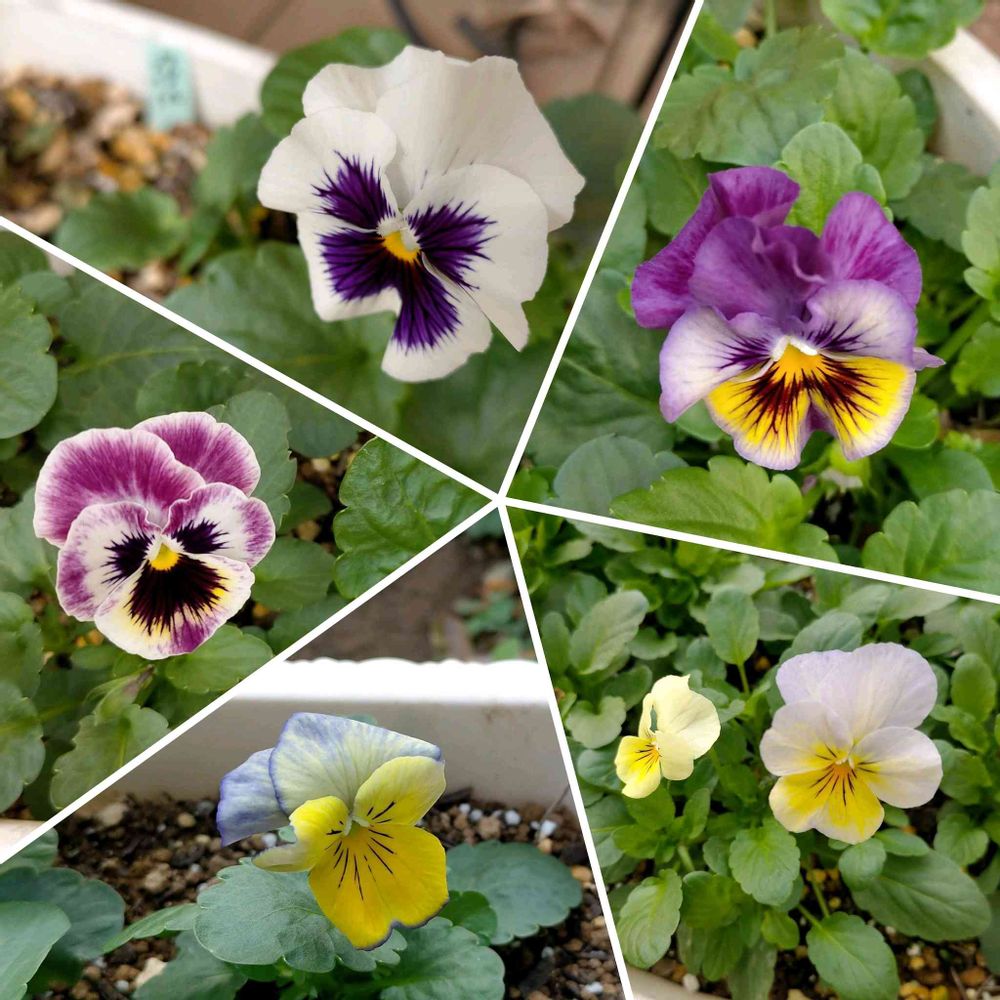 右上から左回りに、パンジー・フリズルシズルミニのラズベリー、ブルー、バーガンディの種からの開花ですが、ラズベリーは紫っぽい? ブルーは白花だし、バーガンディはラズベリーっぽい? もはやフリルでもなし。かーなーりー違いますね😅💦 この採種したプランターは4色植えていたので交雑もあるかもしれません。