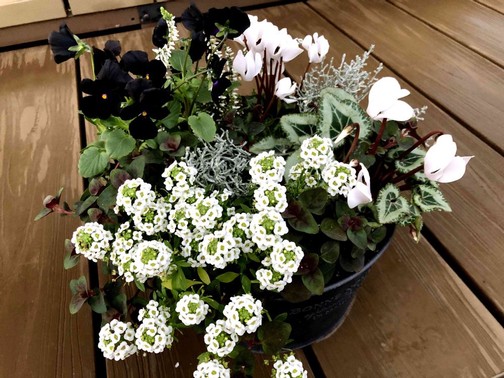 黒のビオラ、白のシクラメンを使った寄せ植えお待ちしてました🤭