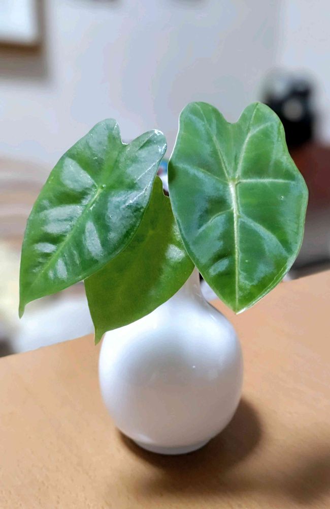 2025.8月に某サイトで購入した【アロカシア チャイ】の 突然変異?なんだろう 購入時、元々有った葉を(1枚目の葉)として、 下から新たな葉が出てきてる状態で到着しました(2枚目の葉) こちらに来て初めて出てきた葉に異変が。。 育て始めて出てきた初めての3枚目、4枚目 (途中から、斑1、斑2、、と続きます) どこまでこの謎の斑入葉が続くのか、 いや止まるのか……記録していきます