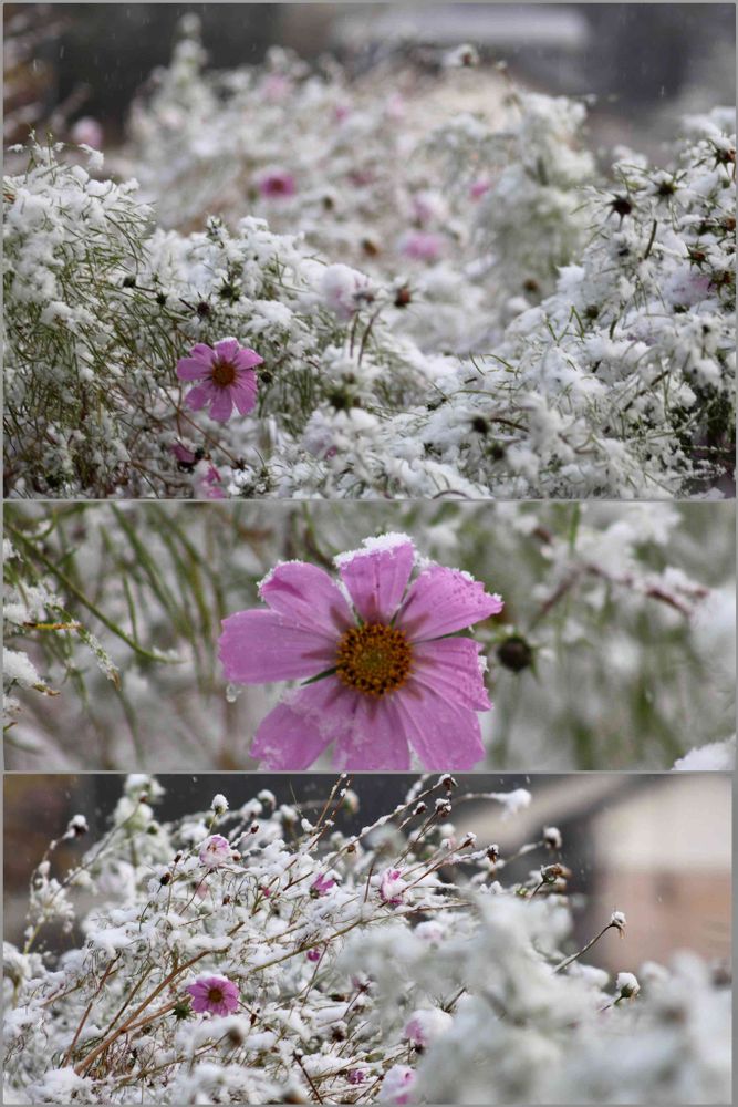 まだコスモスが残っていて長引く夏の花と早く来た冬が重なり珍しい光景が見られました。これは果たしてラッキーといえるのか?心配です😟 だけど綺麗でした〜❄️🌸