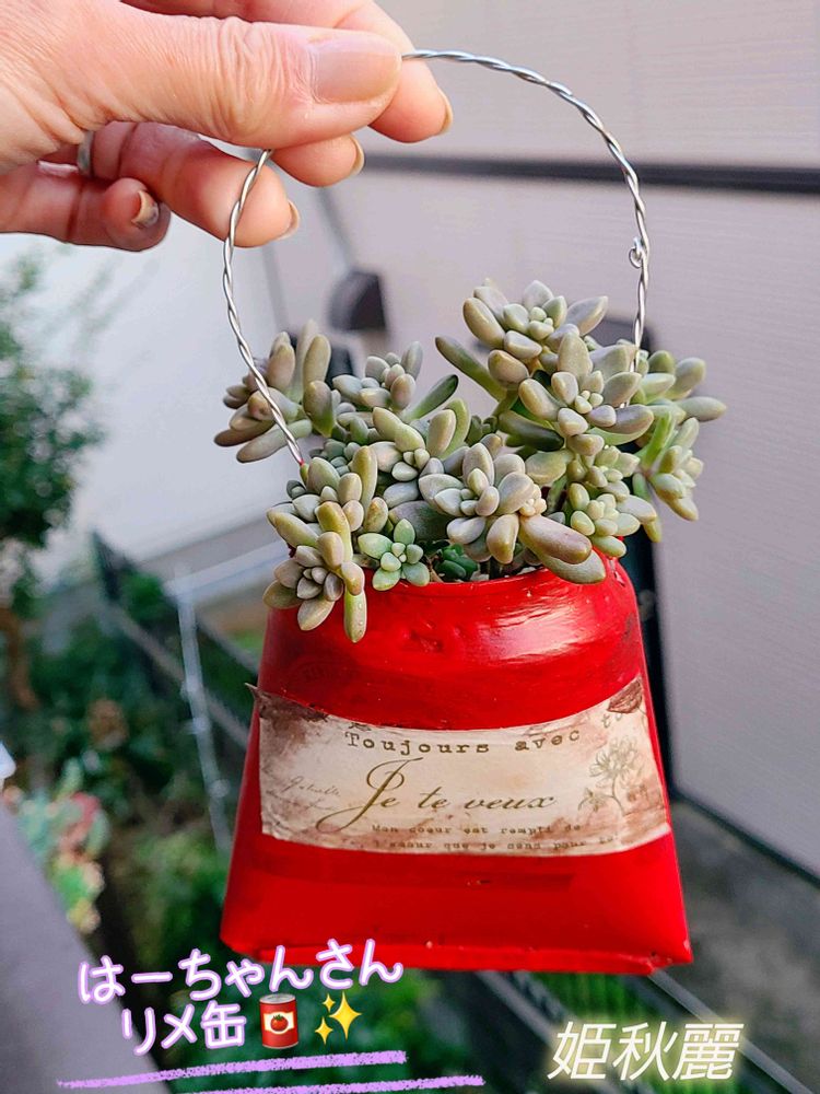 姫秋麗がお日様不足で徒長して春に頭を✂️してこのリメ缶へ乗せて置きました😊取った葉っぱも隙間にパラパラして。