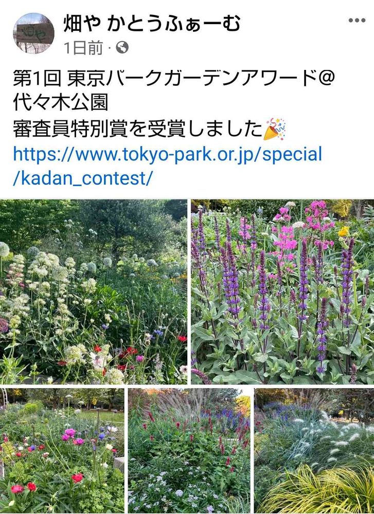 私がシーズン中、苗を求めてほぼ毎月行く畑やかとうふぁーむさんが東京パークガーデンアワードで審査員特別賞を受賞しました。