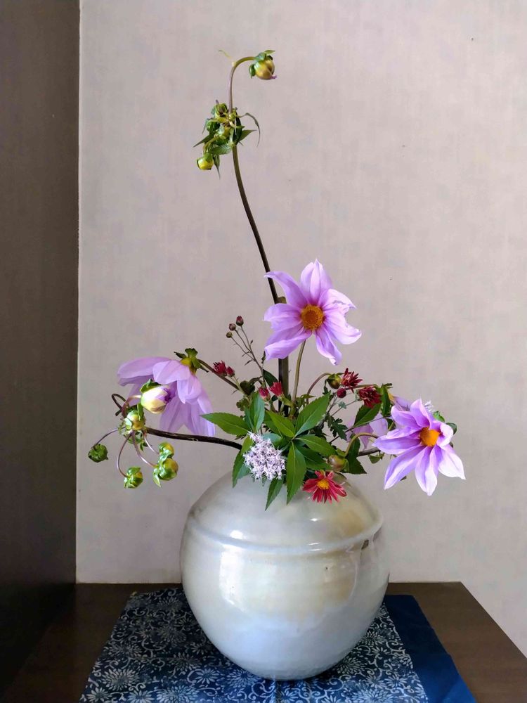 花の色にブルーが少し入っているので、花器の下の敷物と響き合って素敵な空間になっていますネ😊