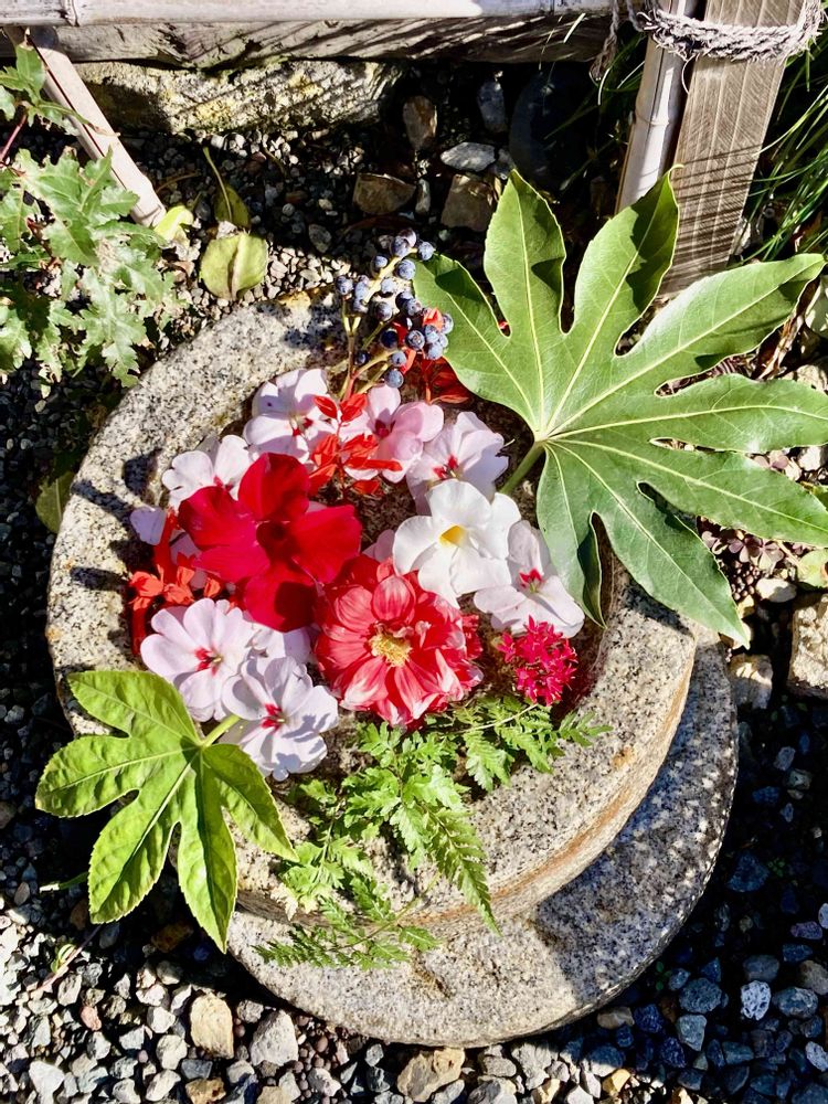 花の終わりに花手水,花手水,古民家の庭先の投稿画像