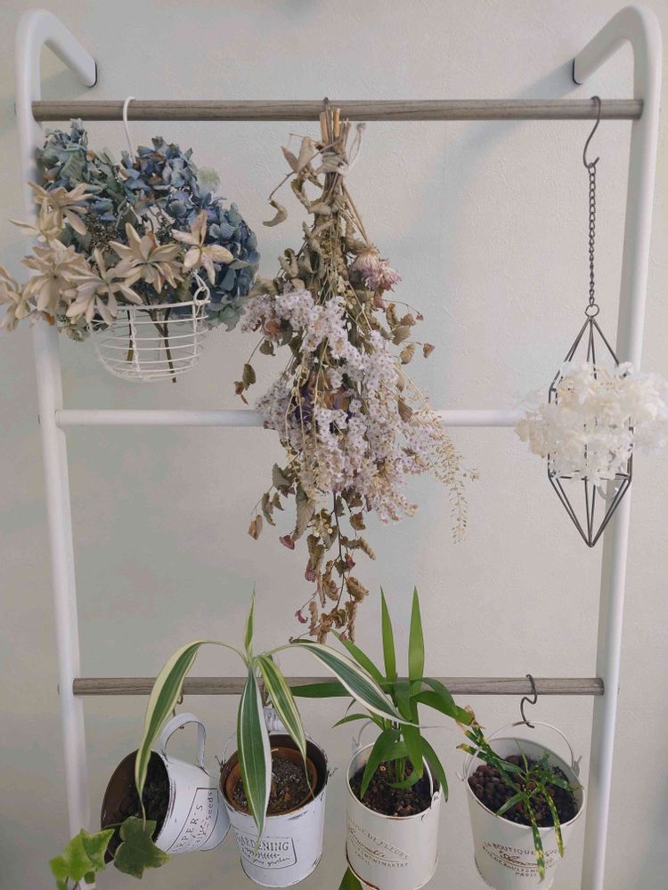 ラダーラックの上段にセッティングした、自作のミニスワッグ&ドライフラワー✨