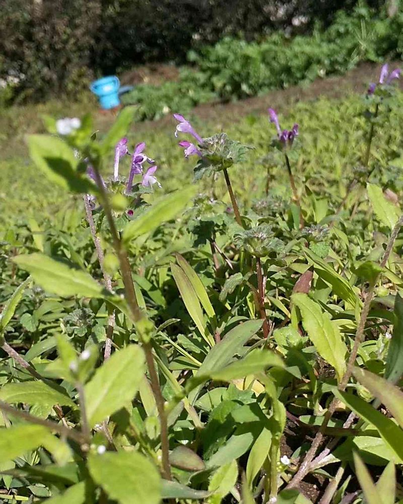 イネ科の雑草がビッチリ生えた畑にホトケノザがはえていました。