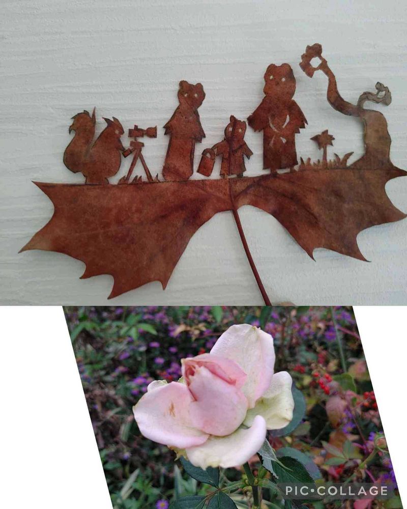 昨日農業際に行き、人の多さにすぐ帰り道端で拾った一枚から。七五三さんの季節にあわせてのリトさん真似っこ葉っぱアート。
