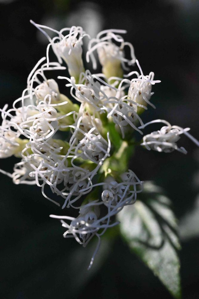 頭状花は5個の筒状花からなり、先端は5浅裂、雄しべは合着し紫色を帯びています。葯筒の中央にある花柱が花粉を押し出し、白い糸状の柱頭が2裂して長く突き出します。