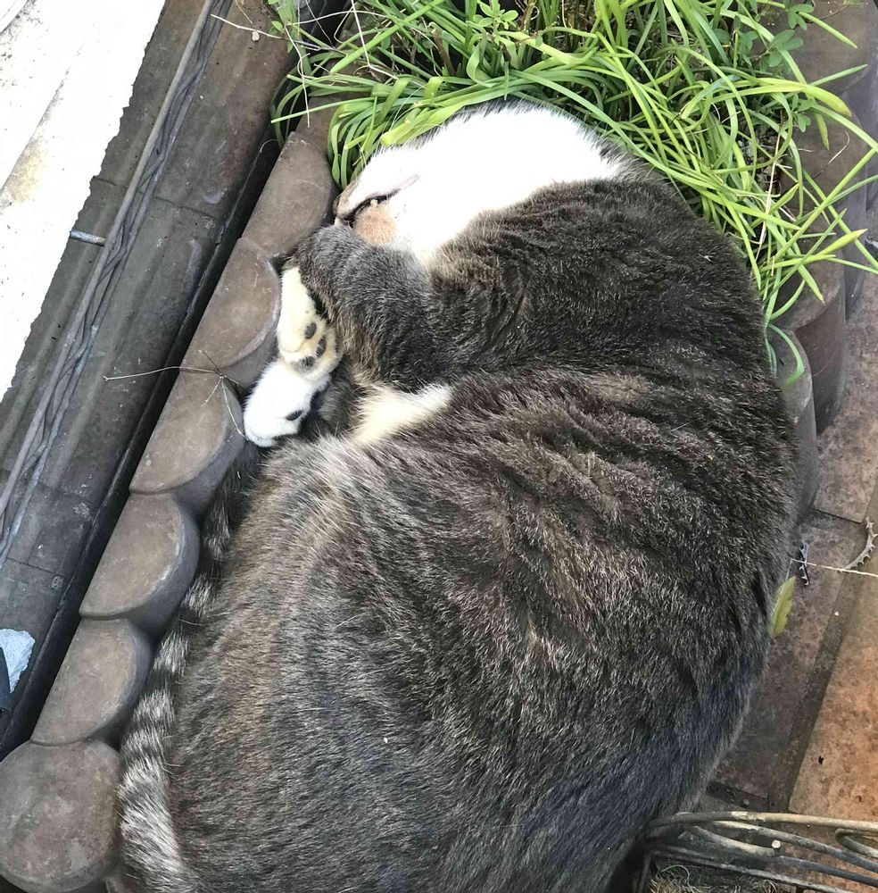 プランターにシンデレラフィット😆爆睡中の訪問猫のタヌキ君